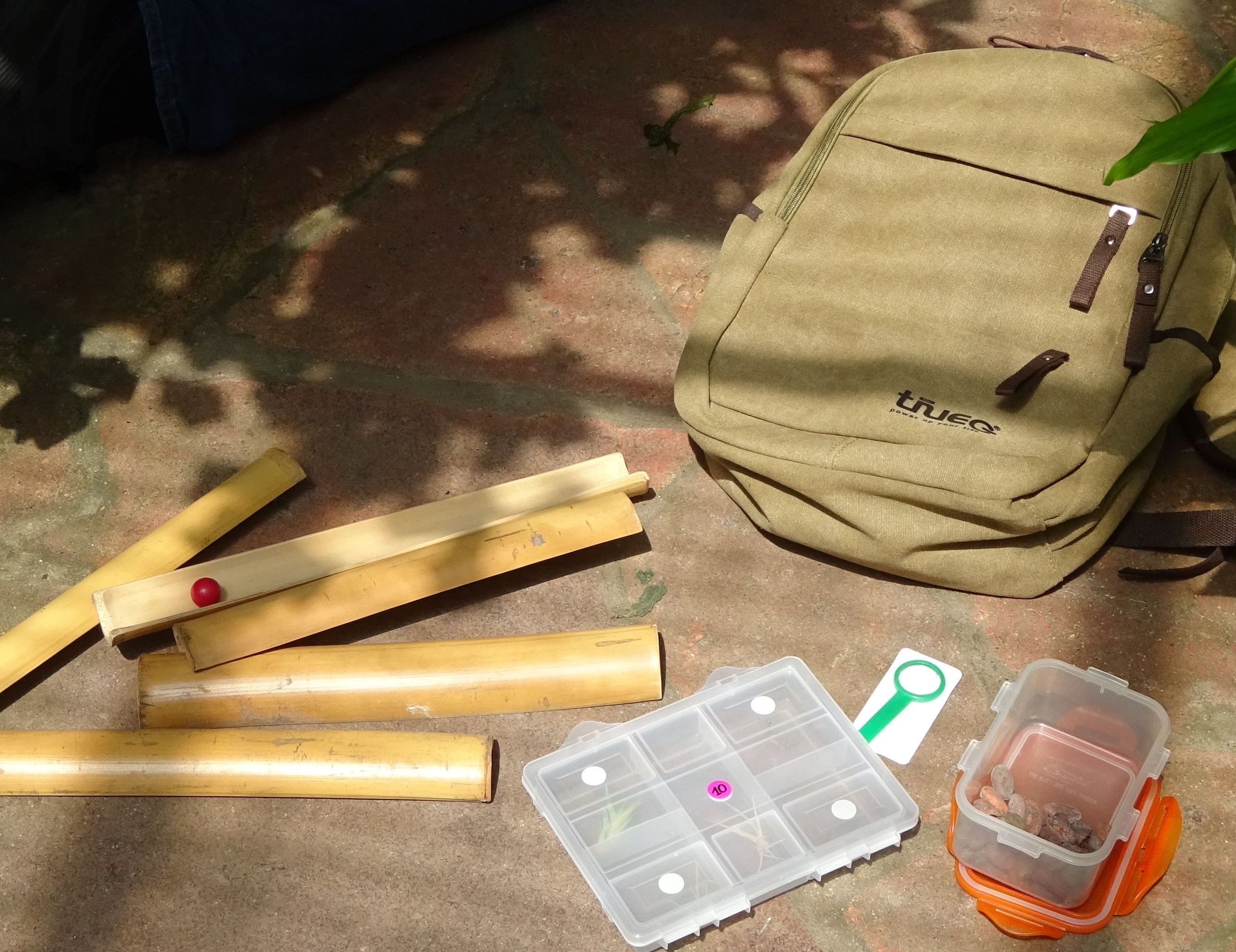 Der Entdeckerrucksack enthält einen Ordner mit Informationen und Anleitungen sowie Materialien für die verschiedenen Spiele, Experimente und Entdeckeraufgaben, die jeweils einer Station in den Gewächshäusern zugeordnet sind. Die Begleitperson kann ja nach Alter der Kinder, Zeitbudget und eigenen Wünschen aus 10 Entdeckeraufgaben ein individuelles Programm für die Gruppe zusammenstellen.